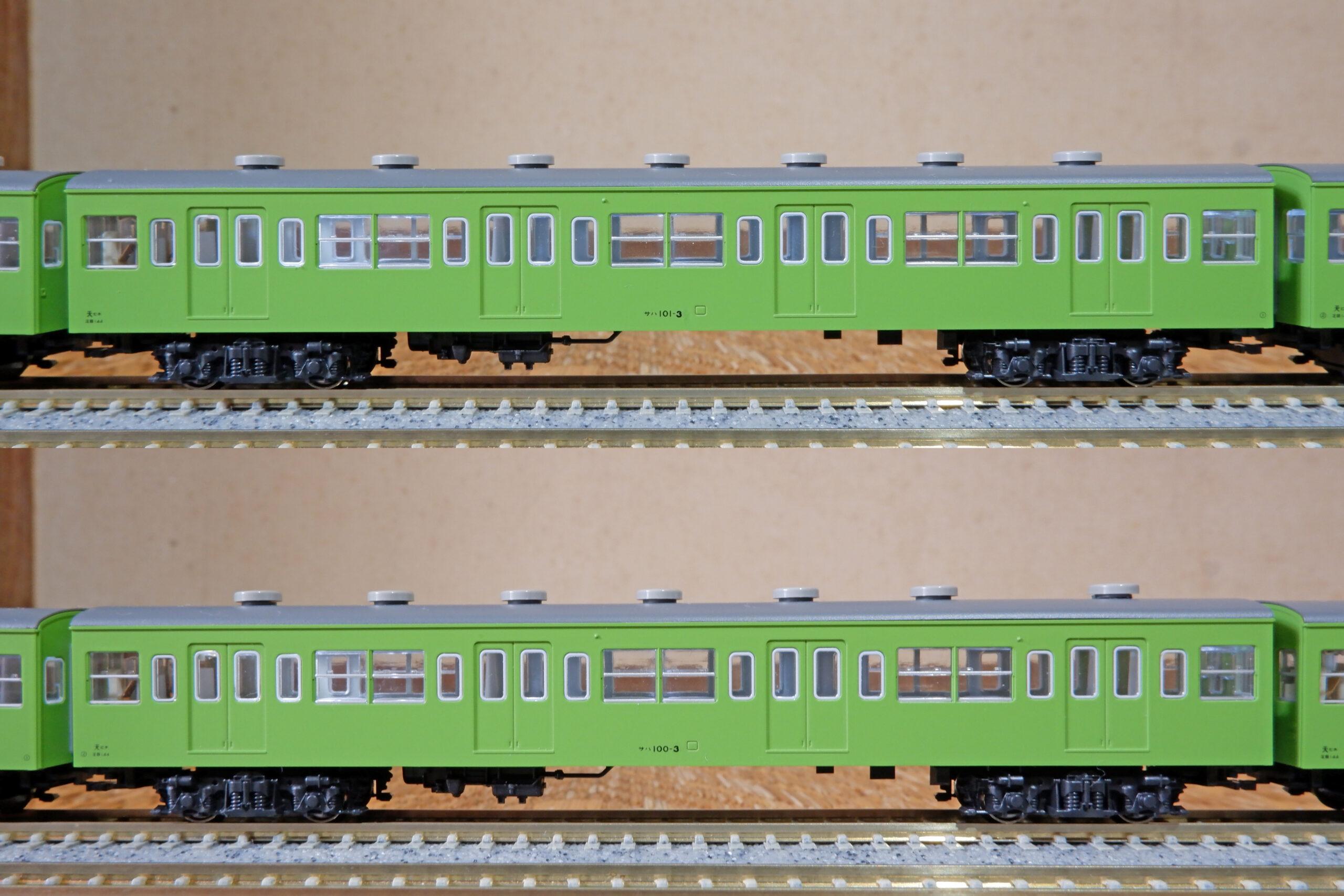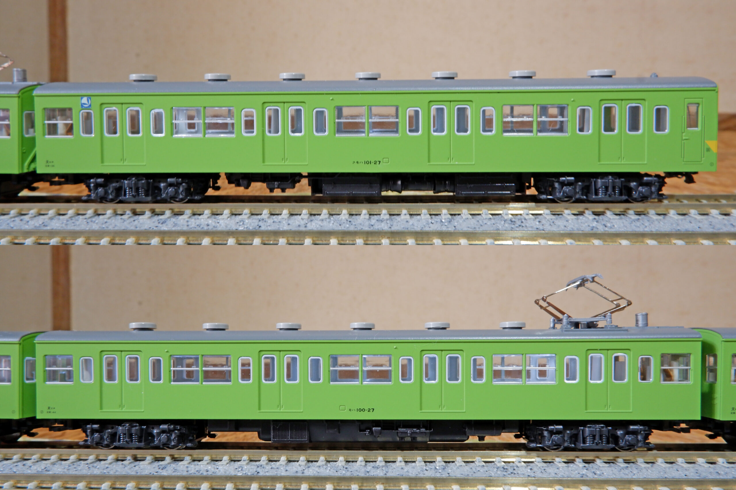 M5+M’c5は歴代関西線の101系電動車では最若番でウグイス色へ変更されて転入しています。初期車ですがクモハ100のパンタグラフはPS16へ交換され首都圏らしい姿ですね。ナンバーは同一ですがモハ101-5は昭和33年3月29日、クモハ100-5は昭和33年3月17日(共に近車製)と新製日は異なります。模型ではKATOの関西線色のパンタをPS16へ交換しただけです(笑)