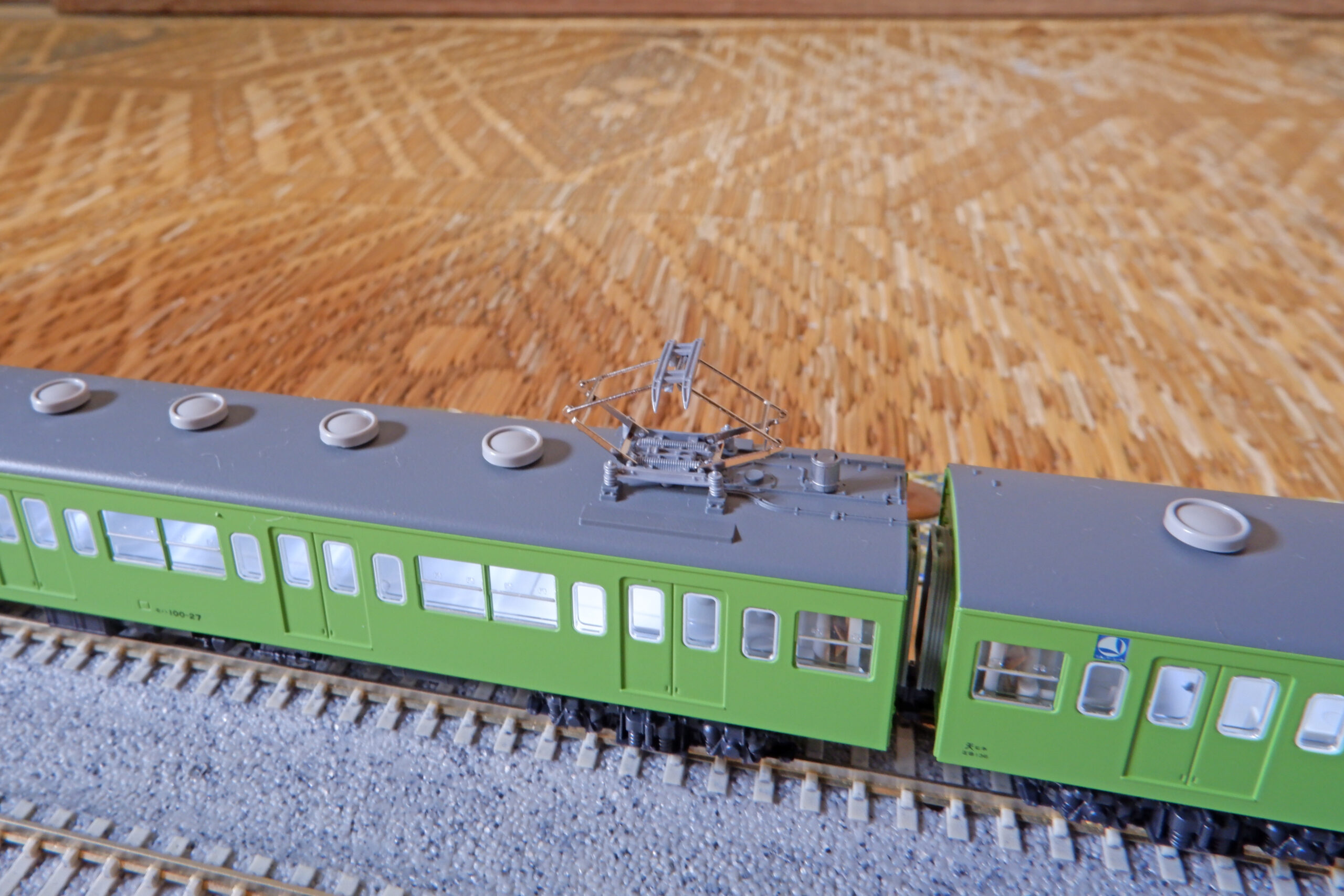 屋根を見る機会の多い鉄道模型、サハ100-3はパンタ台とランボードが撤去されグロベンが増設されましたが、PS13パンタグラフを搭載したモハ100-27も特徴があり、通常は黒色ですが晩年の検査時に灰色となって出場しており目立つポイントです。ASSYで確保したクモニ83のパンタグラフに交換して再現しています。