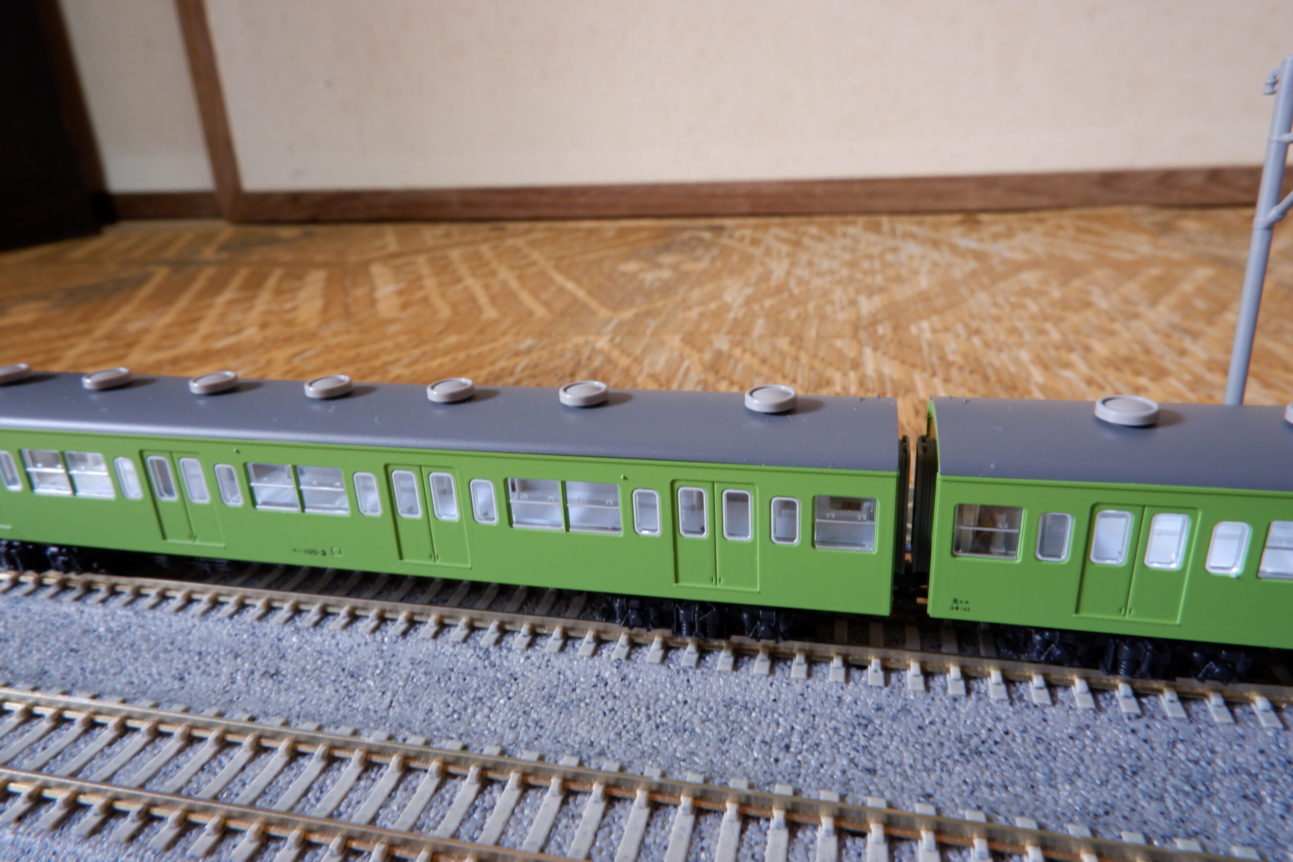 中間に入るサハは101・100ともナンバーは3で水害応援では最初に武蔵小金井から駆け付けた編成の2両でオレンジ色のまま運用に入りました。最初、見かけた時は廃車予定車なので先は短そうと思っていたのですが、1983年2月にウグイス色へ変更され走っているのを見かけた時は「あれ?色が変わっている!」と驚きました(笑)廃車は1985年2月でした。サハ100-3はパンタ台が撤去されグロベン増設されていたため、模型でもサハ101の屋根をベースに加工しています。少し位置がズレたグロベンも中々面白いものです(^^)