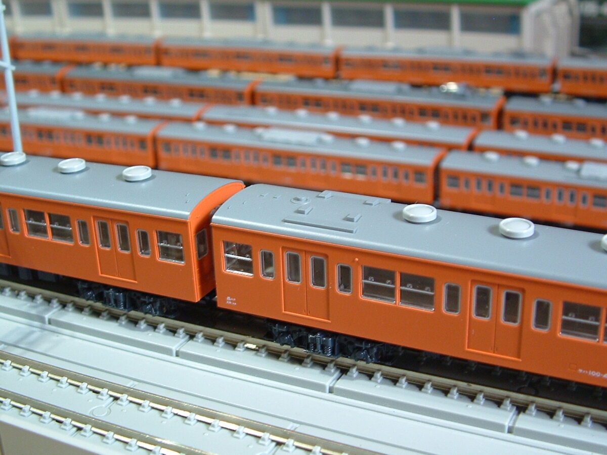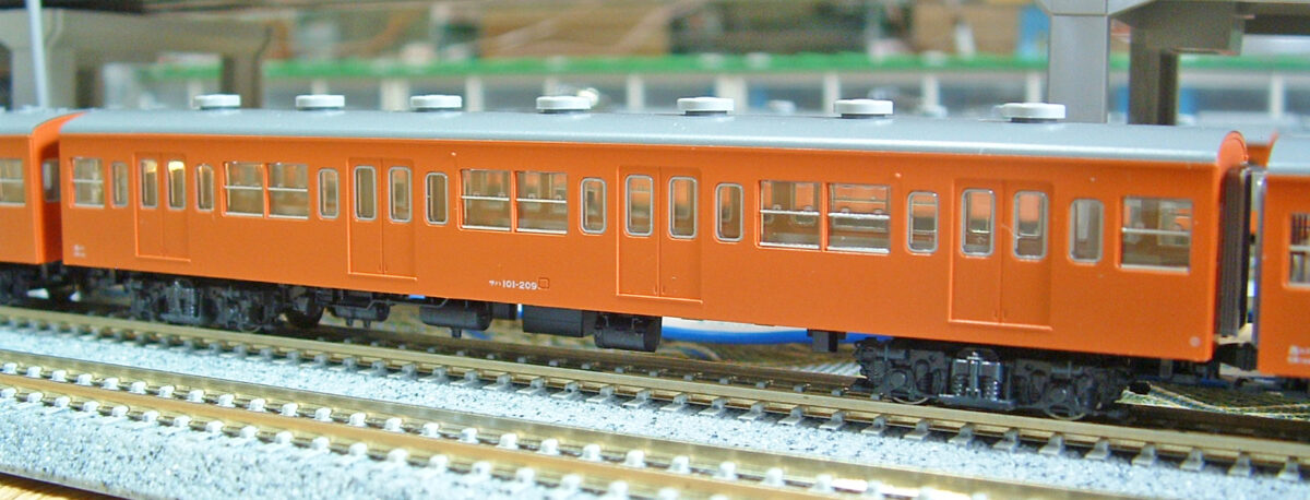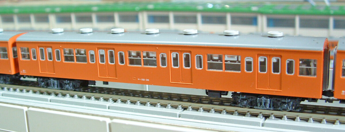 サハ101は使用電力の問題で全電動車編成を止めて中間に付随車を入れることになり、将来電装化できるように昭和33年から誕生した形式ですが、結局モハになることは無く全電動車計画も中止されたので昭和38年以降の109~は電装準備から完全な付随車に変更され,、主電動機点検蓋の廃止や昭和40年製造分からは台車がTR64へ変更されています。しかし、模型では設計変更を再現できません(笑)