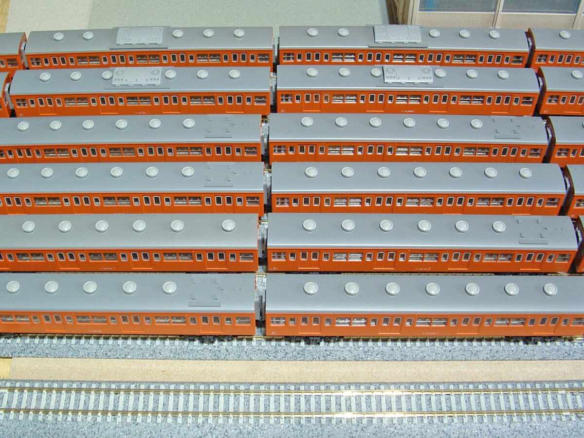 101系7両基本編成のサハが3両連結される部分より右はMG・CP付のサハ101または100の200番台、左は上の冷房改造車がサハ101、非冷房車はサハ100になります。パンタグラフ取付け台のある車両がサハ100になりますが、左の下から2番目のサハはパンタ台とランボードが撤去されグロベンを追加したサハ100になります。101系は特に編成は固定されず検査の都合で組み替えも多く、基本編成の真ん中に連結されるサハがMG・CP付ならサハ101・100どれでも組み合わせ自由なんですよね。基本的にサハ101・100の0番台は同一ナンバー車で組まれることが多かったようですが。