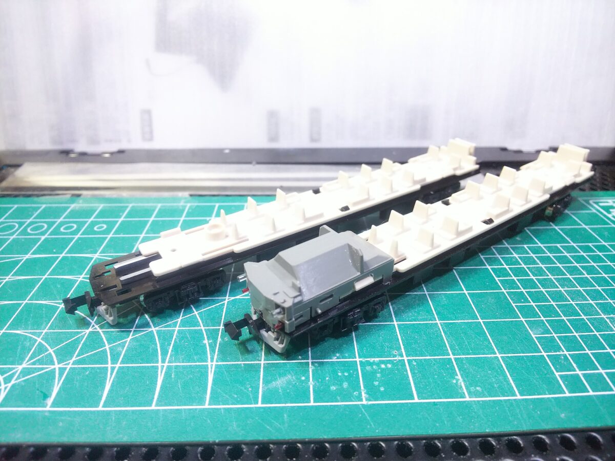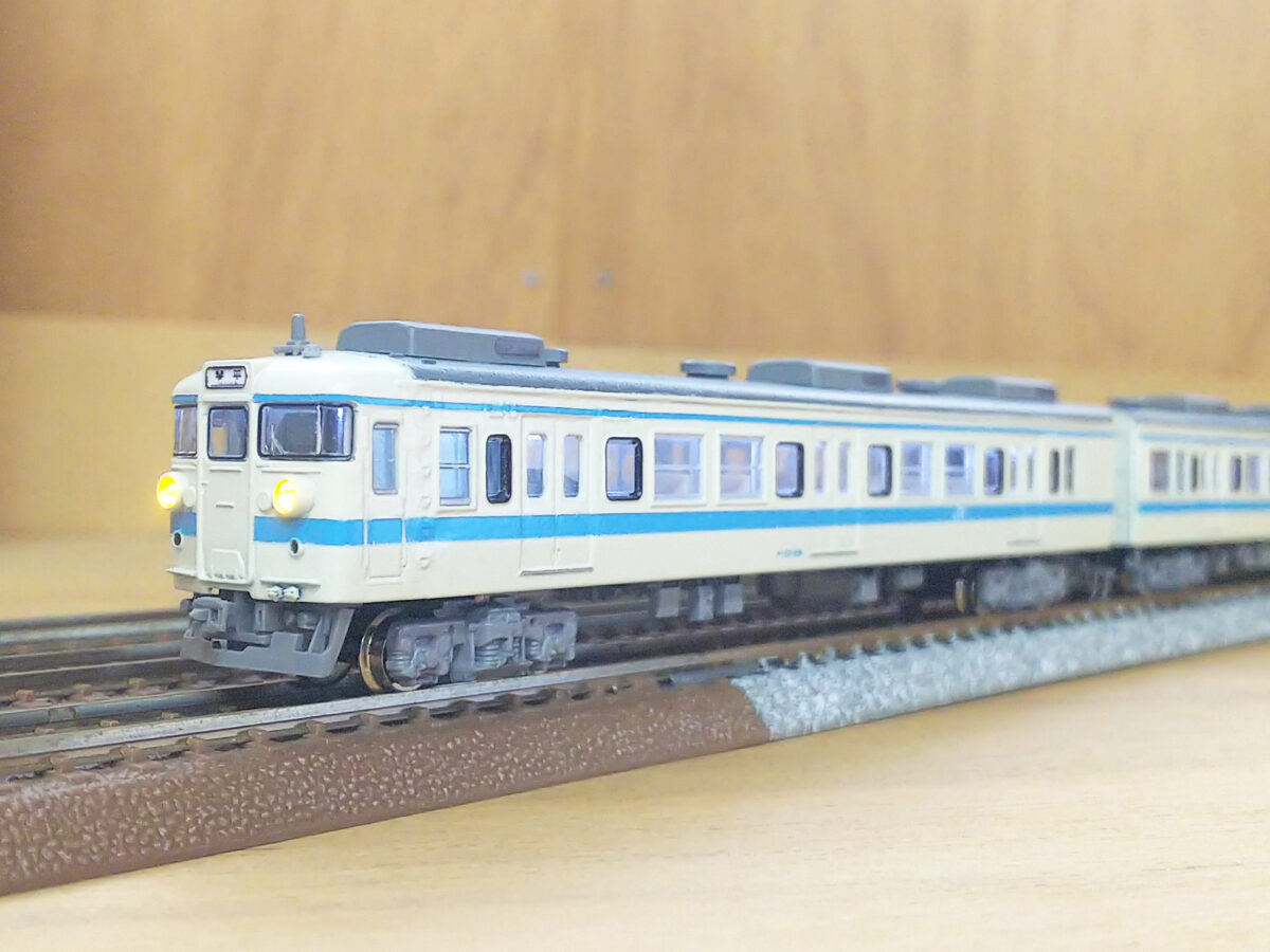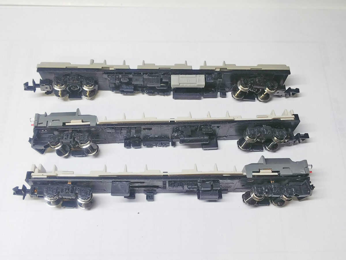 床下はクハがKATOの旧製品クハ411増結セットを使用、ライト無しのためライトユニット+ケースは旧製品の165系ジャンク車から流用、支障する部分をカットするなどして納めました。床下機器は鉄コレやグリーンマックスから類似品を使用しています。実車は細かい機器が付くので破損防止のため一部省略しましたが、目立つブレーキユニットは撤去しています。モハはTOMIXの近郊形から流用、晩年の姿として床下はグレーにしています。