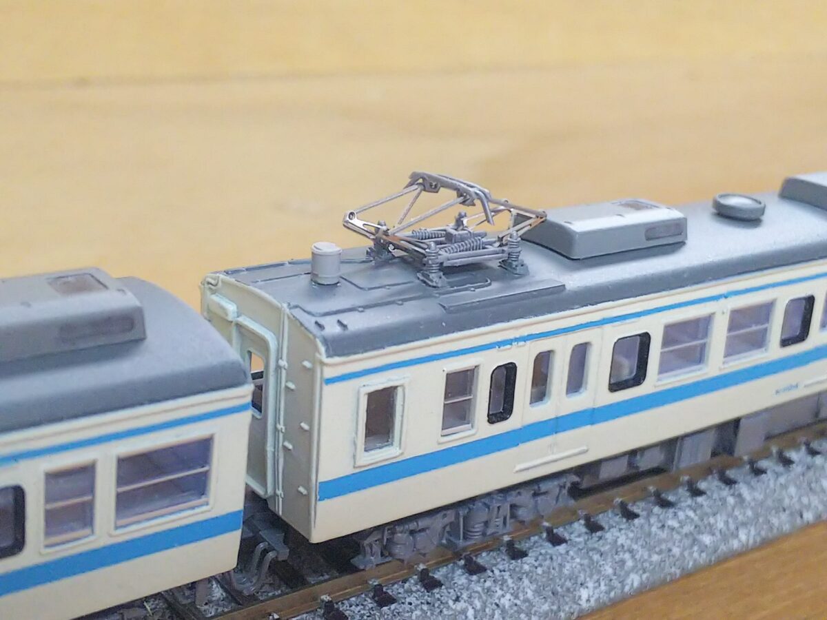 クーラーはグリーンマックスのWAU102、パンタグラフはマイクロエースの121系青帯1本をピンク帯から変更直後の設定にしてPS21パンタに交換、余ったS-PS58を流用しています。