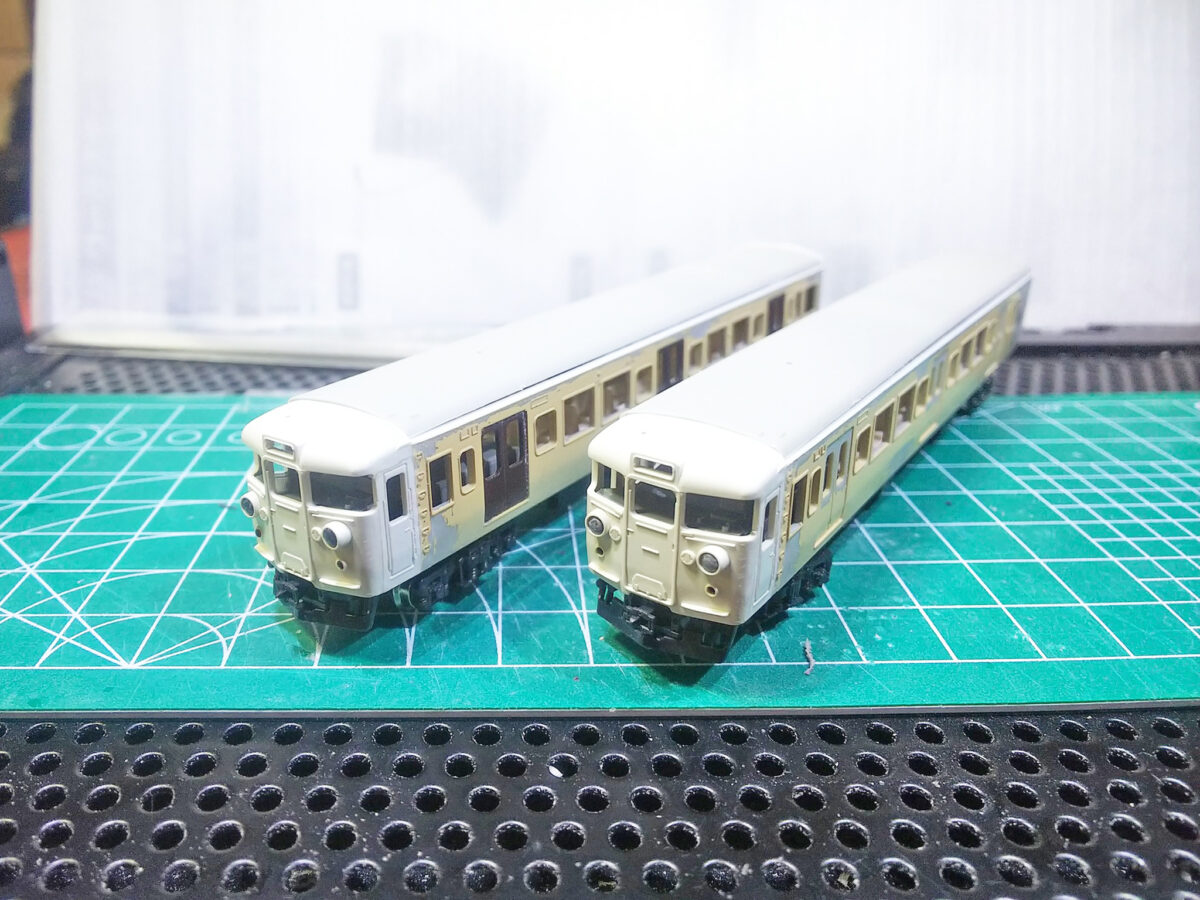 ユニット窓のB4編成はグリーンマックスのキットから製作しました。天地が雨樋1本分短いので、モールドされている雨樋を削りプラ板で作り直し、クハ111-3002以外はドアが金枠式になるためHゴムを削除、Hゴムのクハ111-3002はキットのモールドが気に入らないのでTOMIXのジャンク車からドア部分を移植しています。(一部の側面がクリーム色になっているのは豊田の115系300番台を製作途中で完成品が発売されたため、放置していた車体を流用したためです)