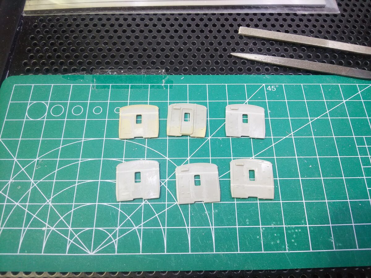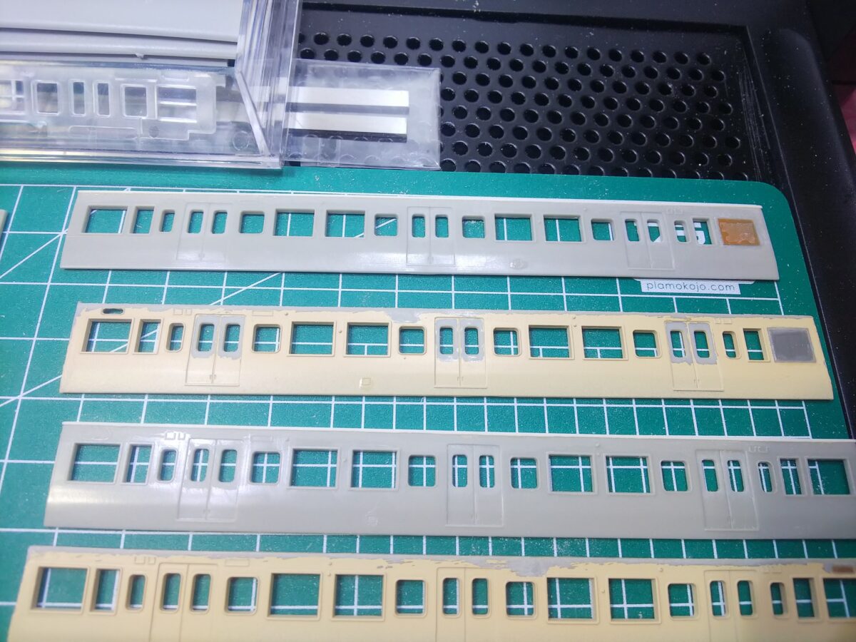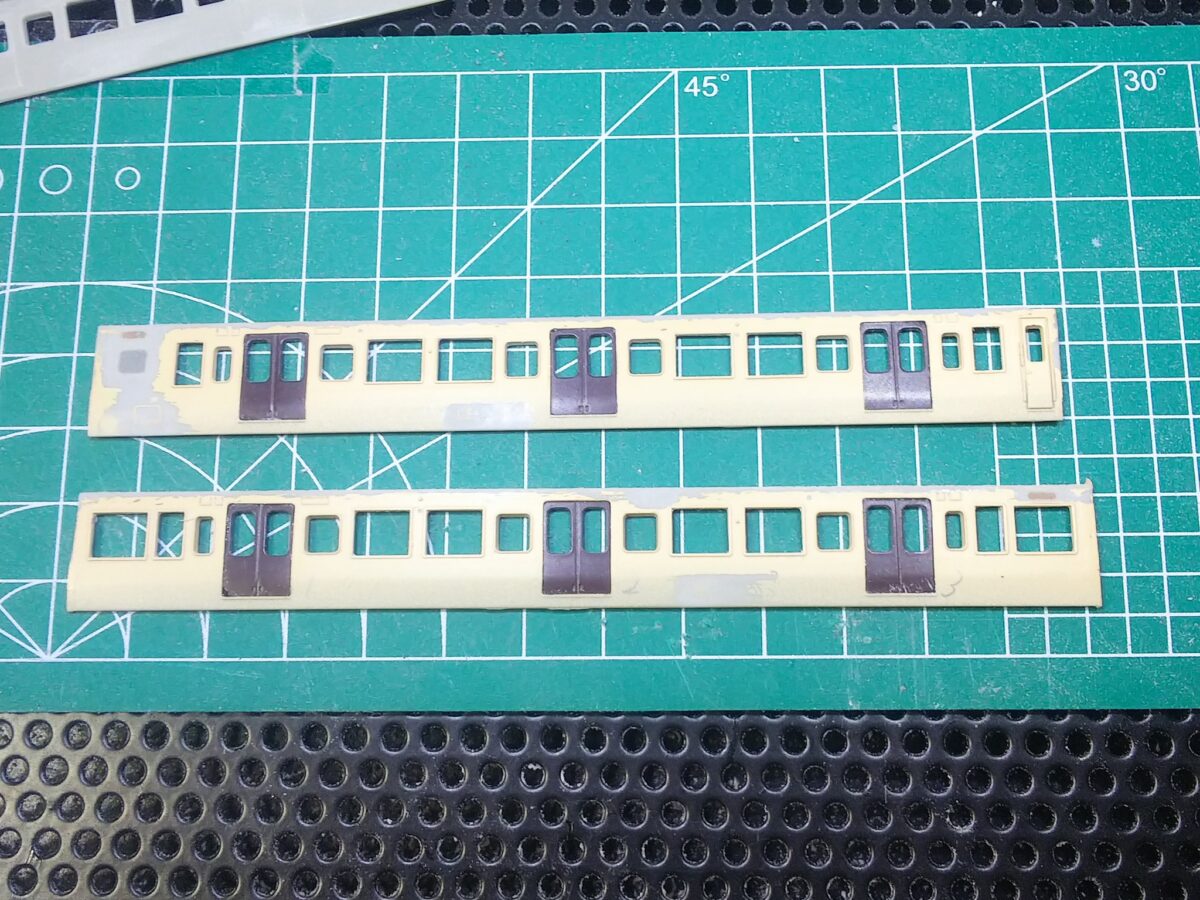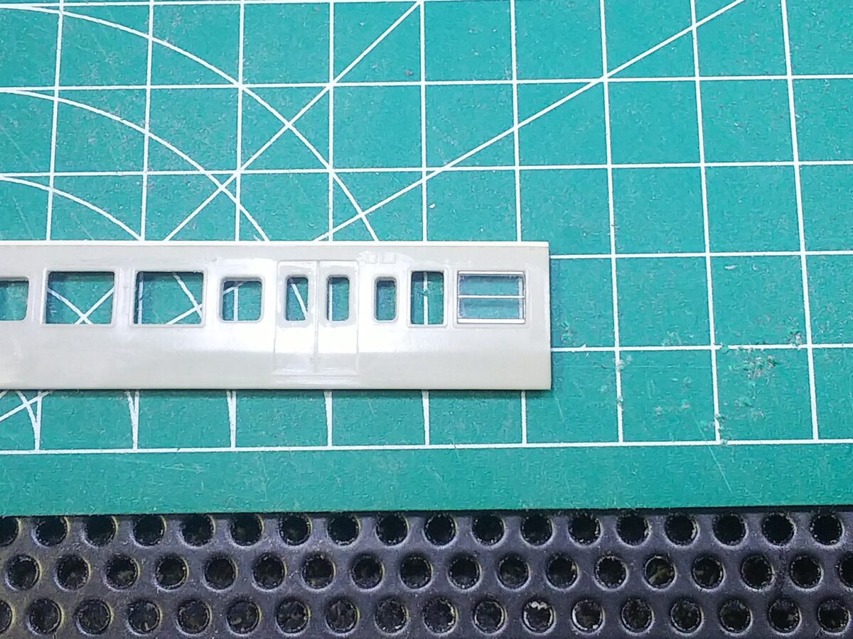前面はKATOの旧製品165系を使用、2位側の乗務員扉は移設しています。妻面はグリーンマックスのキットを使用しますが、側面の雨樋加工により天地が短くなってしまったのでモハ110の配管付き妻面は2枚使用して途中で切り継ぎ、他は途中でカットしてプラ板を挟み側面と天地サイズを合わせています。側面窓は上段下降式になるため、KATOの旧製品近郊形側面窓が入るように加工しました。三の字印刷がこのような形で活用できる日が来るとは(^^)