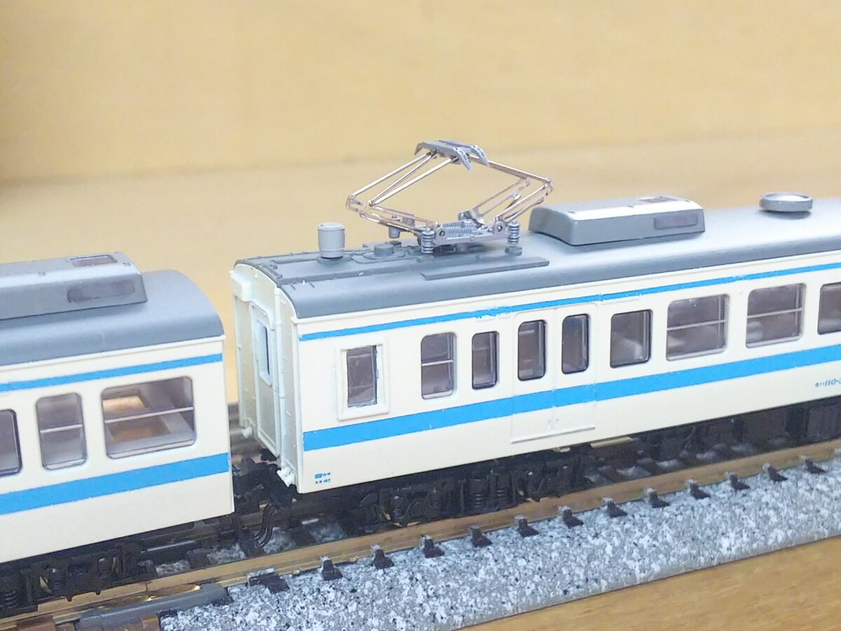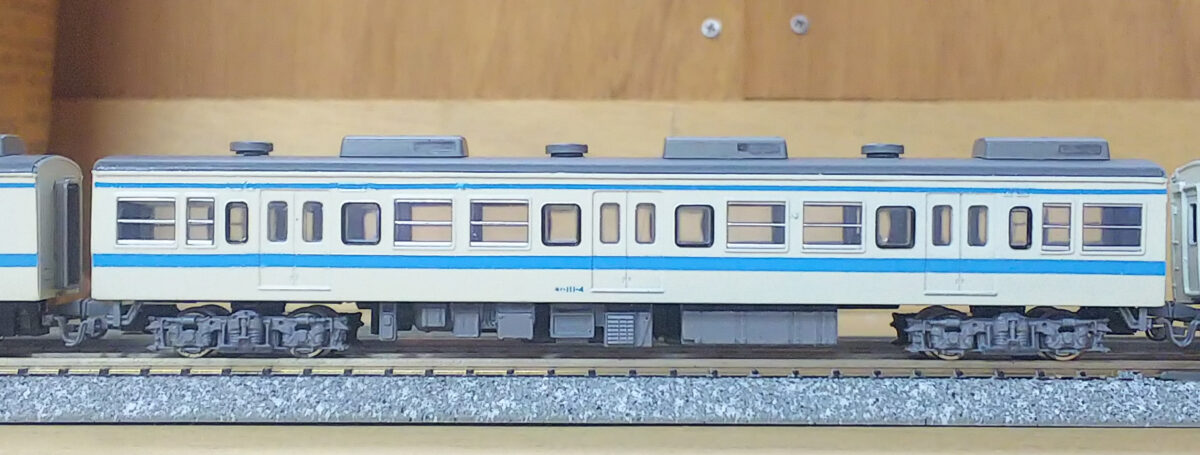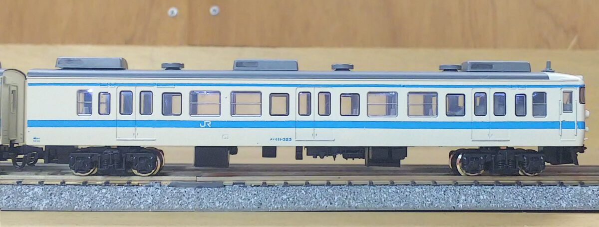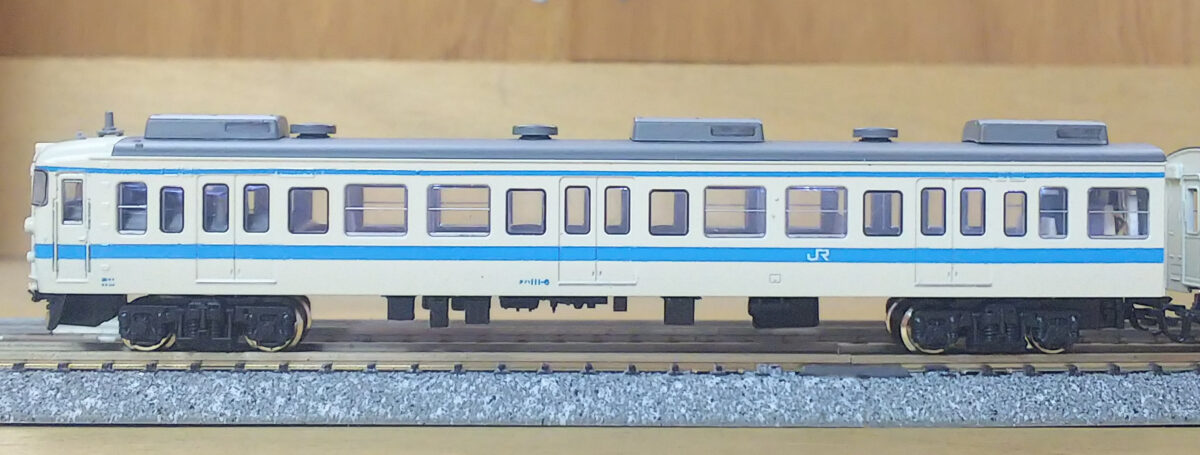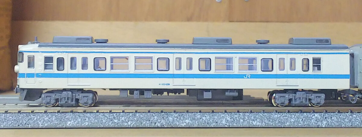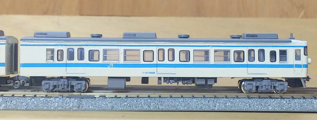 唯一の非ユニット窓だったB2編成はα-modelのキットから製作しました。比較的原形に近いですがクハのヘッドライトはシールドビーム化されているので、KATOの165系からライトユニットを流用したボディのライト部分を移植、トイレ窓の閉鎖とクハ111-323は乗務員室扉上の雨樋をプラ棒で延長、モハ110の車掌室窓を加工しています。結局、無加工の車体はモハ111だけでJR四国の111系は改めて難易度が高いと感じます(笑)こちらは最初の頃をイメージして床下は黒色にしました。