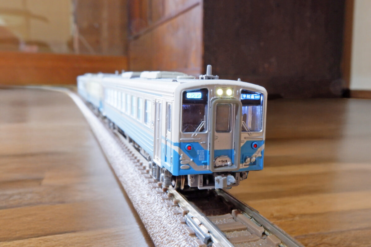 国鉄民営化直前に製造されたキハ54はステンレス車体の2エンジン車で最初見た時は国鉄っぽくないスタイルが印象に残りました。四国に0番台、北海道に500番台がそれぞれ投入されましたが、前面や足回りなど共通する一方で0番台はトイレ無しのロングシート、500番台はトイレ付のクロスシートと当時としては対照的な車内に驚きました。近年はローカル線で運用される気動車・ハイブリット車でもロングシート車が増える傾向ですが、国鉄では意外な展開だった印象があります。0番台は冷房付きで同時期に投入されたキハ185系とも共通する部分が多く見られますね。松山配置でオレンジのストライプも当時は斬新に見えました。