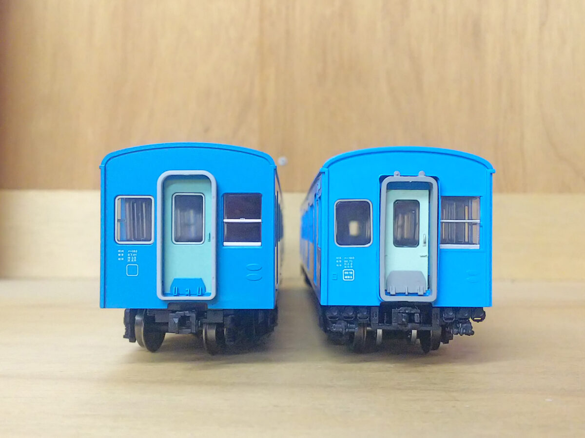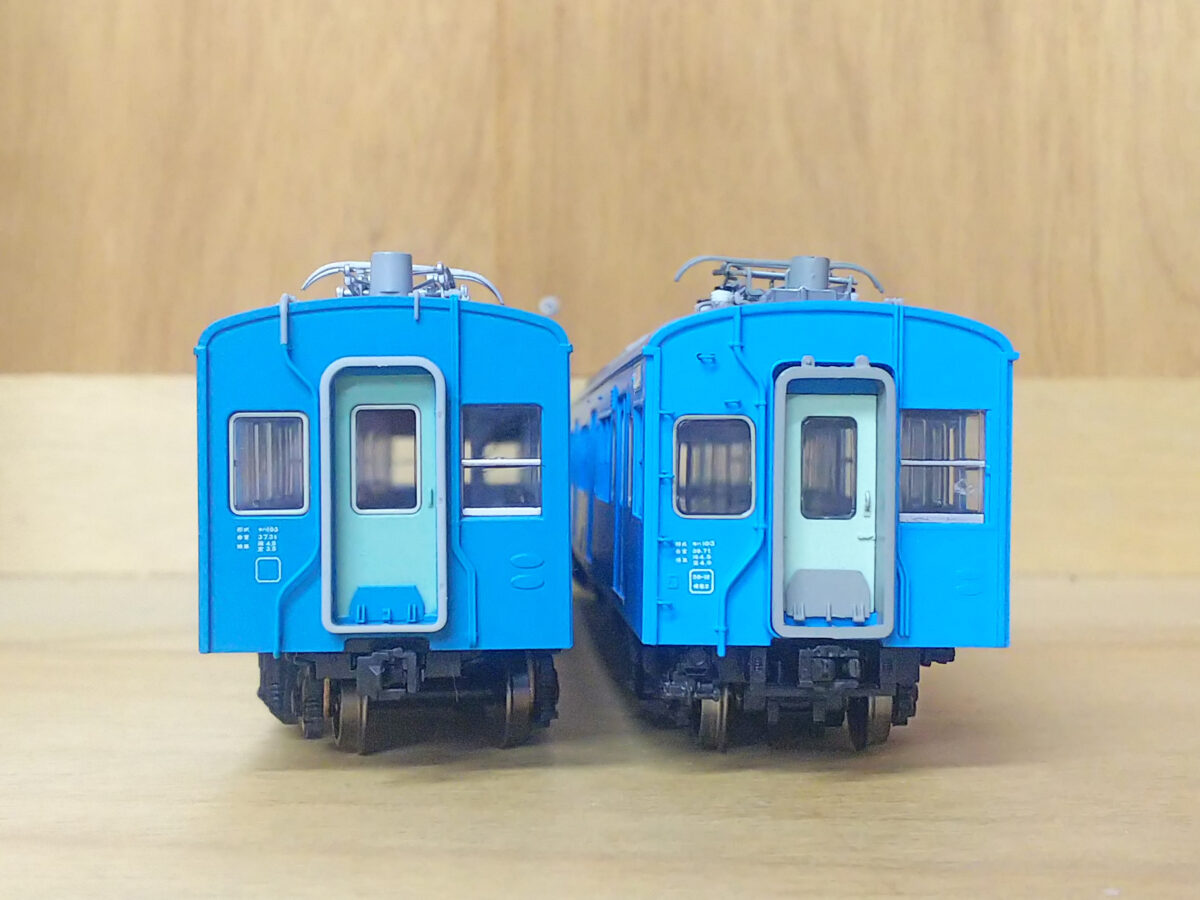 妻面の比較、天賞堂はオプションの可動ホロの都合で形状が独特です。貫通扉の戸袋窓のRも両社で異なります。モハ103は昇降ステップが省略され渡り板はトラムウェイが車体色に塗られています。